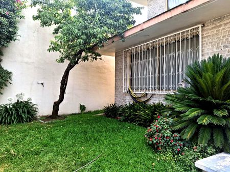 Esta casa de dos niveles alberga en su planta baja una sala de estar espaciosa con salida al jardín, un estudio privado, un área de convivencia con bar, un aseo para visitantes, una cocina equipada con comedor diario y despensa, y una zona de lavandería con acceso al patio trasero y al cuarto de servicio con baño.